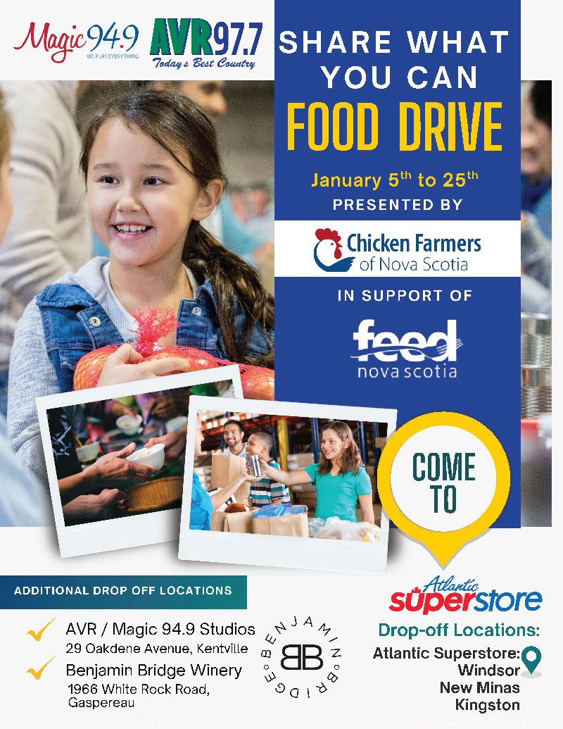 Share What You CAN, presented by the Chicken Farmers of Nova Scotia and Magic 94.9. Donations can be dropped off at Magic 94.9 Studios at 29 Oakdene Avenue Kentville, all three Valley Superstores in Windsor, New Minas, and Kingston, and at Benjamin Bridge Winery in Gaspereau.